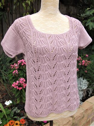 A really pretty, summer top with shell stitch patterning divided by a single stitch worked in the row below to help the rib effect to stand out. The lower edge slightly dips at the base of each “shell”. An easy design to length (or shorten) which you can do before the sleeve shaping by adding or subtracting 10 rows so that you still end up on the correct row before shaping the sleeves - easy! The back is worked in stocking stitch and the narrow borders are all in garter stitch.