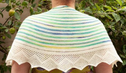 The shawl is knitted from the top down, starting at the back of the neck with an i-cord cast on. The inside edge is worked as you go with a two colour i-cord edge. Once the body is complete a one-colour edging is knitted on, joining one stitch to the body of the shawl on every wrong side row.