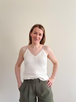 Stay cool and stylish with this timeless crochet camisole pattern, perfect for summer layering or wearing on its own. Designed in a flattering top-down construction, this pattern features moss stitch for a light, textured fabric that drapes beautifully.