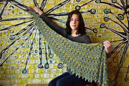 The Sun Salutation Shawl is a mesmerizing meditation on stacked stitch patterns. Starting with a sun shaped center, each consecutive tier shifts the colors as the shawl expands in a crescent shape. A picot edge finishes the shawl with little rays of light.