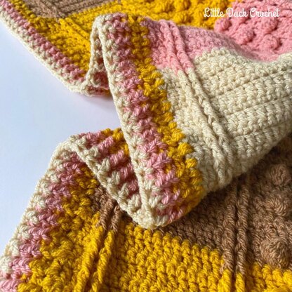 A blanket full of bobbles and front-post stitches with a border of front and back post stitches to make it even more cosy!