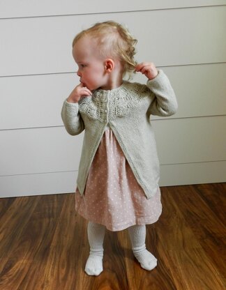 Inspired by vintage style, the Sunday Morning Cardigan features a sweet lace yoke and gently gathered sleeve cuffs. The classic and feminine design will look darling on any little girl. Knit seamlessly from the bottom up, the knitter will only need to graft the underarm stitches. The pattern includes a tutorial for the Kitchener stitch used to graft the underarm. The lace pattern is a simple, easy-to-memorize repeat with the yoke decreases worked in the garter stitch rows. This makes this sweater achievable for beginning sweater and lace knitters while still being a masterpiece once completed. Designed to be layered over a dress, the cardigan should be worn with two inches of ease.