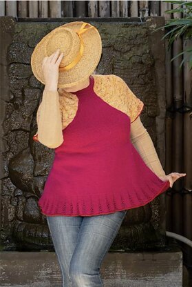 From the Vivacious Vest Collection by Annabelle Drumm. A double layer vest or top using fingering weight yarn, one layer is knit bottom up with a decorative hem, racer back and halter neck; the other layer is knit top-down with raglan short sleeves. Layers are joined at the underarm and neck.