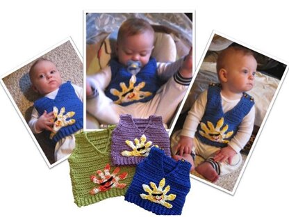 A sunny vest to brighten your little one's day! This is a quick vest to stitch up in many colors. The stitches form a nice "striped" texture and there are buttons at the shoulders for easy on/off. The sun is a simple applique that is stitched on and can be centered or slightly off center for a different look. The cool sunglasses are made from felt, but can easily be embroidered too to avoid any "loose" parts.