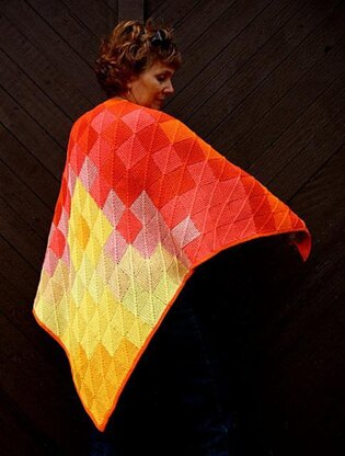A mosaic sunset, worked in mitered squares, makes a pretty wrap for warm weather. Use our color placement, or plan your own (template provided). Approx 16 skeins are required as follows: Dark Yellow - 1 Bright Yellow - 2 Light Yellow - 1 Muted Yellow - 1 Light Coral - 2 Dark Coral - 3 Light Orange - 3 Dark Orange - 3