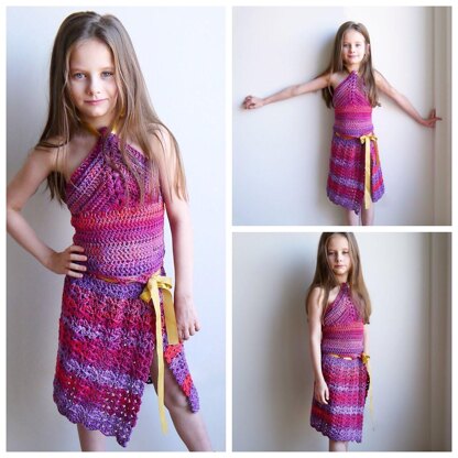 • Crochet hook (6mm, US – J/10, UK - 4 ) • Sample made from Alize Bella Batik in 1 ball 180 m / 196 yds,weight – fingering/ 4ply , if you use this yarn, work 3 strands together, for 7 y.o. girl top and skirt you will need 9 balls • One more recommended yarn: Katia Jaipur in 1 ball 280 m / 306 yds, weight Lace/2 Ply, using this yarn work 4 strands together, for 7 y.o. girl top and skirt you will need 6 bals • You can also use any othr yarn, and work with 1 strands, than use yarn weight Aran/10ply