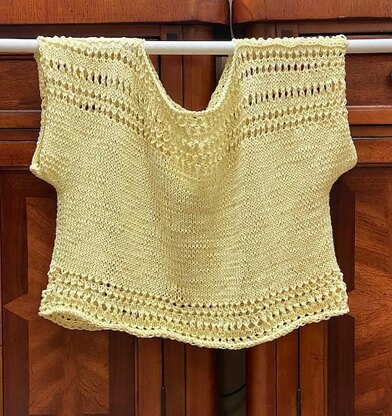 Pattern Rating: Easy T shape. Lace pattern . Rolled edges. It is an easy to follow pattern for beginner knitters. A quick description : Work 2 similar parts, then sew the shoulders and body. Size: M/L Measurements without stretching: Top to bottom : 19”, 48 cm Underarm flat measurements , not around: 22”, 56 cm.