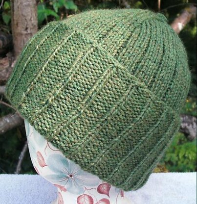 This quick and easy ribbed hat featured a fold-over cuff which reveals the reverse side of the ribbed pattern. Makes a great gift.