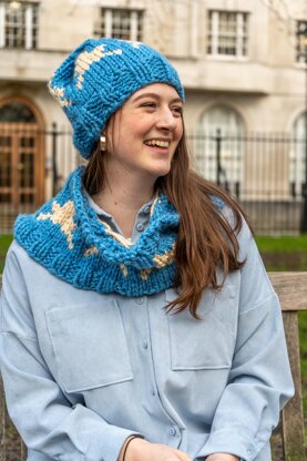You're a superstar! Stranded colourwork and an unusual folded look crown give this hat a fun twist, and the matching cowl will keep you snuggly warm in the winter months.