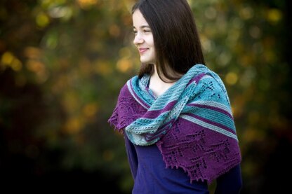 Supplejack is an asymmetrical triangle that traces the developing skills of the knitter. Stripes of squishy garter stitch begins the piece. This is interspersed with blocks of bold colour until you reach the first simple lace section – eyelets edged with garter stitch. More colourful stripes ensue as you work your way down the shawl, encountering small cable twists, a lifted stitch technique and finally move on to the lace sections worked over a stocking stitch background. The piece ends with an elaborate cable-lace border edged with pretty picots. When worn the more elaborate cable-lace section rests alongside the initial garter stripe section in a pleasing contrast of your knitterly skills.