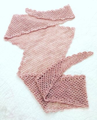 The scarf starts with a few stitches at one tip and ends with a few stitches at the other tip, and has an interior mesh stitch pattern bordered on all sides with a scalloped edge. There is no need to add any additional edging, so when you are finished you are really finished!
