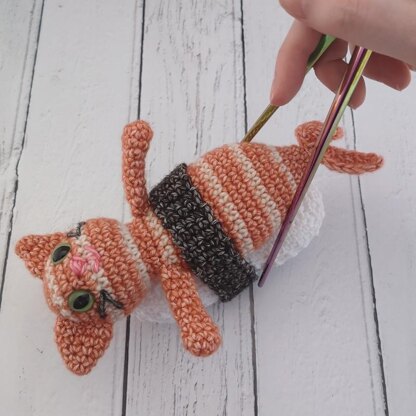 MATERIALS NEEDED - 3.5mm (E/4) crochet hook, dk (Light Worsted) weight yarn, 2 x 12mm (0.5") green, cat, toy safety eyes, polyester toy stuffing, yarn needle. Stitch markers.