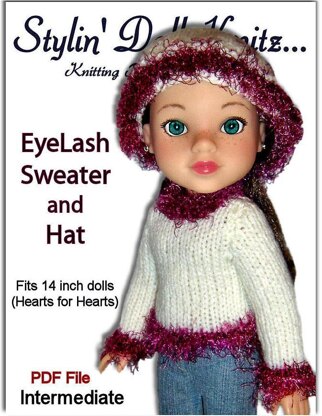 Eyelash Trim Sweater and matching hat.Pdf doll clothes knitting pattern, fits 14 inch and Hearts for Hearts dolls (Corelle Les Cheries doll).