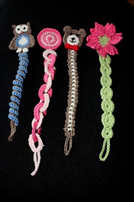 This pattern set includes 4 adorable patterns for soother clips ~ owl, teddy bear, sunflower (or any colour flower), and joined circles.