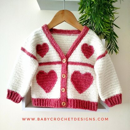 This cardigan is started with the bottom ribbing and worked up in one piece, the hearts are made using colour changing. Then joining is required to make the right front and back, the shoulders are seamed. The sleeves are then made in joined rounds, the steps are outlined, with a photo guide and chart for each size.