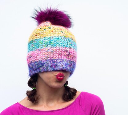 When it comes to yarn, knitters are like kids in a candy store. We want it all and we want it now. The Sweet Shop hat was specifically designed for those thrilling colors that you cannot imagine putting back on the shelf. Knit in the round from the bottom up, this slouchy hat is great for beginners and expert knitters alike. The stretchy stitch pattern is fun to knit and extremely forgiving for knitters who don’t like stressing over gauge. Using just a single skein of yarn, it can be knit with speckles, variegated, gradient, or solid yarn. To create soft, fuzzy stripes like mine, hold a strand of mohair with the main yarn. Change the color of your mohair yarn to create delicious rainbow drama.
