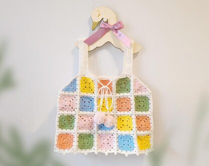 DIMENSIONS Each granny square is approx. 7.5cm Finished garment is 38cm wide, 42cm length. Dimension is for reference purpose only