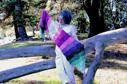 Yarn: Approx 87 yards/20grams each of 12 colors of fingering weight yarn. Shown in Forbidden Fiber Co. Fortitude Conversation Hearts mini set. Size: One size. 77 inch length, 14.5 inch width. Needles: 2 pairs of US size 5/3.75mm 24 inch or longer circulars and/or DPNs if desired. OR 2 cables that you can switch needles back and forth. Notions: Tapestry needle, stitch markers, extra needle cables, scrap yarn. Gauge: 22 stitches by 24 rows (BLOCKED) in stockinette on US size 5/3.75 mm needles