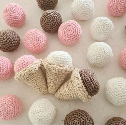 Materials needed: cotton yarn (less than 20g in 8 play for each colour of cone and ice-cream scoop), crochet hook, toy stuffing, yarn needle to sew in ends, scissors, stitch markers if desired