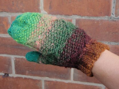 These snug mittens have a heart pattern on the back of the hand, formed using cable stitches and a moss stitch pattern. The palm is ribbed for a comfy fit.