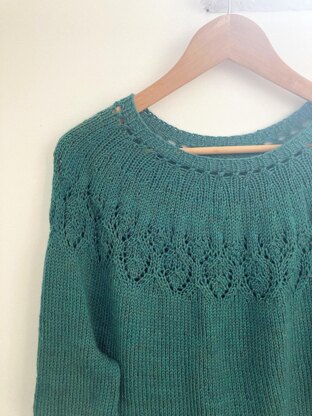 Sweetness is a pretty jumper, worked seamless from the bottom up with a delicate lace to the yoke. Sleeves are first completed, body is worked in the round to underarm, sleeves are joined, and yoke is finished last.