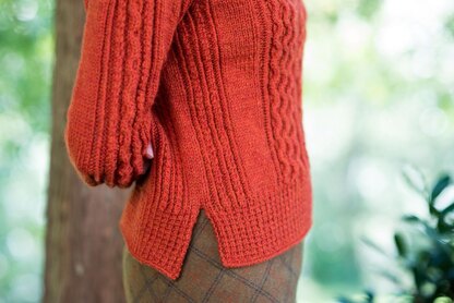 This pullover is constructed from the top down in one piece with saddle shoulders and set-in sleeves.The shoulders are shaped by short rows. There is no body shaping past the armholes; the cabled panel adds some natural shaping. The length of the body and sleeves is easily adjusted.