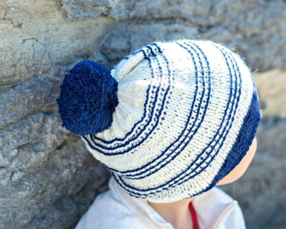 Inspired by vintage sailor outfits, textured stripes in navy and cream give this slouchy hat a nautical flair. A big pom pom on top keeps it fun.