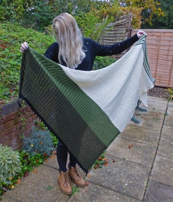 This squishy, snuggly shawl is knit from tip to edge forming an asymmetrical triangle. You begin with garter stitch in cream, moving on to garter stitch stripes in cream and green, followed by more cream garter stitch. Changing colour for the lace section using two shades of green and ending in a few rows of garter stitch in black, with a picot edge cast/bind off. The lace pattern is easy to follow, making it an ideal introduction to lace and texture. The shawl is an easy knit ideal for relaxing evenings.