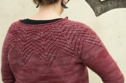 This sweater was inspired by round yoke icelandic sweaters. Starting with a stockinette collar, it is knit from the top down with a lacy chevron patterned yoke. It then transitions into the reverse stockinette pattern body of the sweater and finishes with a stockinette hem. The sleeves are a 3/4 length and have a cute key hole opening at the cuff.