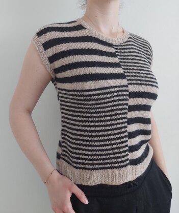This tee is worked flat in stockinette stitch, back and forth in pieces from the bottom up and seamed. Stitches for neckband are picked up from the neckline and, just like the armhole bands, worked in k1, p1 rib. The stripes are worked in 2 sections, using intarsia knitting technique.