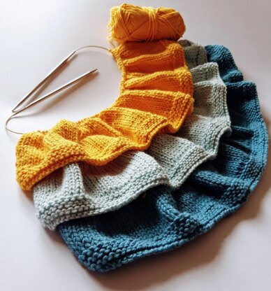 The frills and body are knit flat and joined at the sleeves to knit the yoke in the round.