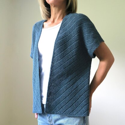 It is worked in one piece on the bias, from the top down in a garter stitch stripe pattern. The construction is similar to a shawl, but once the sleeve trims are added and the sides are seamed, it transforms into a cardigan!
