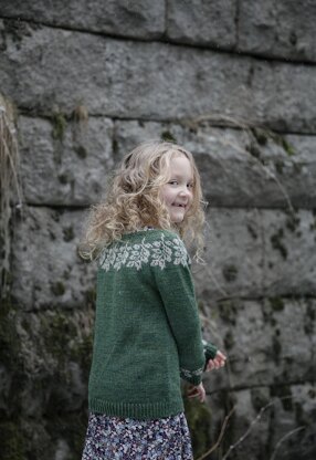 This sweater is worked top-down seamlessly. The sweater has a round yoke with lovely leaf pattern. The sweater has long sleeves with little leaves just before the cuff ribbing.