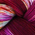 Straightforward garter stitch is interspersed with sections of narrow two-row stripes in alternating colors. This shawl is a compelling and fast-paced knit with absolutely no purl stitches… until the border.