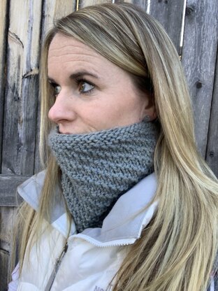 This cowl is easy to slip on and off, and will fit under a jacket collar without causing too much extra bulk. It has a nice diagonal rib that wraps around the whole cowl with top and bottom edging. It can easily be lengthened or shortened depending on your needs.