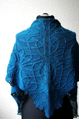 A top-down triangular shawl inspired by beautiful Celtic knot-work, and worked in hand-dyed fingering weight/4-ply yarn. The intricate edging features twisted rib and eyelets. Two sizes are given, but the size of the shawl can be increased if you have extra yarn (the sample shown in the photographs is in the larger size).