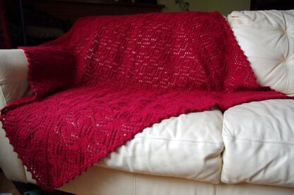 As rich and beautiful as the Berber area it is named for Tamazya is a deeply textured lace blanket worked with a geometric inner pattern and ornate outer border. This stunning cover is created with a strand of worsted weight wool and laceweight mohair held together for visual stitch definition and a slight bloom. The picot border is worked on the WS and the bumps are blocked out for emphasis.