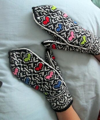 These stranded mittens are designed to be knitted with just two colors, and then decorated with duplicate stitch embroidery. You can use any colors as long as you don't switch light and dark on the charts. The PDF has three different 64 sts. wide options, and one 56 sts wide chart for thicker yarn. The pattern is in pictorial form without any written instructions. Some mittens knitting experience required.