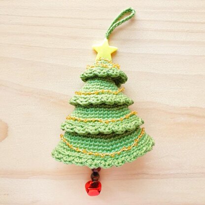 - You will also need; 6x 8mm wooden beads, a star bead, 1.5mm jingly bell, yarn needle for sewing in ends, and some embellishments to decorate your tree