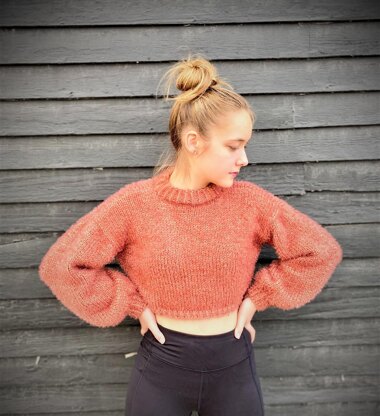 I designed this easy little crop pullover for my daughter. The short length is perfect for wearing over her leotard to ballet class and looks stylish with high waist jeans or over a dress. The short midriff balances out well with the long balloon sleeves and mock neck collar. We chose this fuzzy eyelash yarn, but any bulky weight yarn would work.
