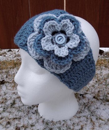 This pattern is for a trendy Tapered Earwarmer with a large flower. It includes instructions for a button enclosure.