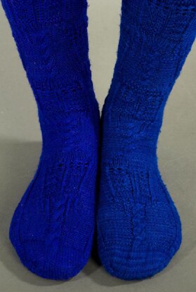 Inspired by Dr Who, these knee-high socks are from another Time and Dimension entirely. Featuring a cable and police phonebox pattern with expanded calf with the initials 'DW' worked in, these socks are constructed toe-up using easy to follow charts with additional written instructions. Uses a heel flap, short-row and gusset technique for turning the heel. Rated as intermediate for difficulty and suitable for a competent sock knitter.