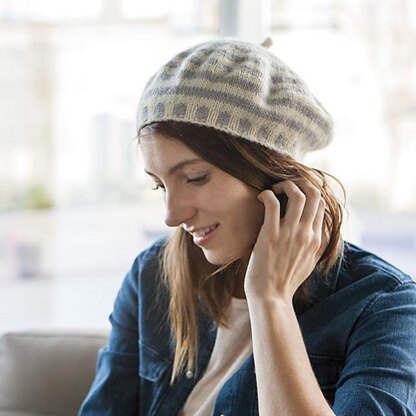 The beret is knit in the round from brim to tip and features a striped rib brim and a concentric circle design achieved by switching colors at the beginning of each stripe so the colors are carried up the inside.