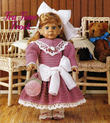 Tea Time Frock, #1397. Our little Victorian miss is having a tea party with her favorite Teddy Bear. Crochet pattern leaflet includes instructions to make the dress, pantalets, shoes, and purse, with instructions given for sash and hair bow made from organza or any sheer fabric. Uses an assortment of cabled cotton (or substitute worsted weight acrylic) with trim and shoes in perle cotton (#10 can be substituted); purse made from sport weight chenille and metallic Gold Rush. Fits 18" American Girl Dolls, Springfield Dolls, Götz Dolls or dolls of a similar size.