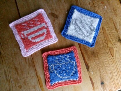 Knitting pattern for 3 reversible coasters. These are made on DPNs using the "double knitting" technique to produce a double sided fabric, with the design on both sides (with colours reversed).
