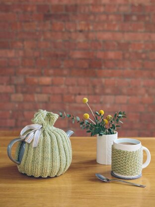 From the Knit Rowan website: Knit this homeware teapot and mug cosy from 10 Simple Projects for Cosy Homes. A design by Sarah Hatton using our wonderfully soft machine washable worsted weight yarn, Pure Wool Worsted (wool), the teapot cosy is worked in rib and the mug cosy in moss stitch. One ball of yarn will make 1 teapot and 2-3 mug cosies.