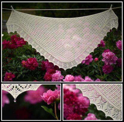 **Materials Required:**1465 yds cream lace yarn US 3 (3.25mm) circular needle 0.5mm crochet hook (for attaching beads) Tapestry Needle 3 – 15x7.5mm teardrop crystal beads 12 – 11x5.5mm teardrop crystal beads 28 – 3mm round crystal beads