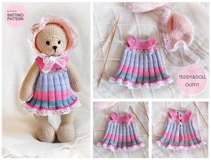 Teddy Bear and Doll Clothes Knitting Pattern PDF, Toy Dress and Bonnet.