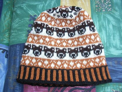 Cute teddy bear beanie in light and dark brown. Teddy bear faces and paws are all around and at the top there are seven paw prints.