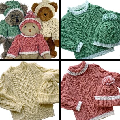 The child & teddy sweaters feature a loving heart cable & your choice of crewneck or turtleneck collar. The hats can have a single or fold-up brim. Knit in a single color or add an optional accent trim. The detailed pattern includes both charts & written instructions, plus photos showing the completed garments.